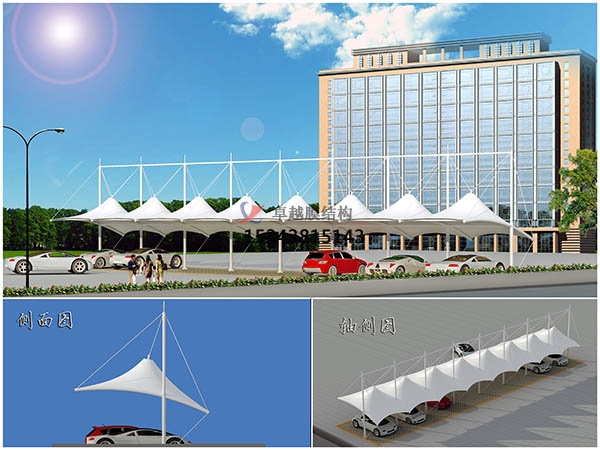 2.根據實地考察結果,設計合理的結構圖。膜結構充電樁車棚的設計非常重要, 既要考慮充電樁的大小尺寸又得考慮環境天氣,如果風大雨雪大的地方盡量使用帶帽頂結構的設施,這樣可以充分緩解風雪的阻力和積雪融化后的處理。在風力小或者有折風墻的地方可以用直挑或者七字型膜結構車棚,這樣可以節省工程成本縮短施工工期。