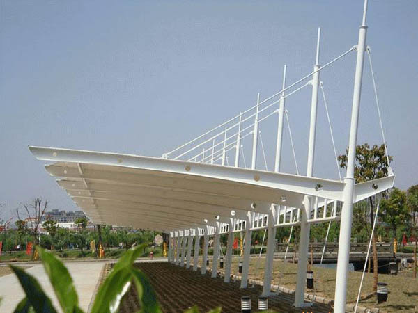 膜結構停車棚后面是硬邊,前面挑起,使用拉索拉起固定,前后有落差,方便排水.另外有一種雙挑的也可歸類到平頂式里面.