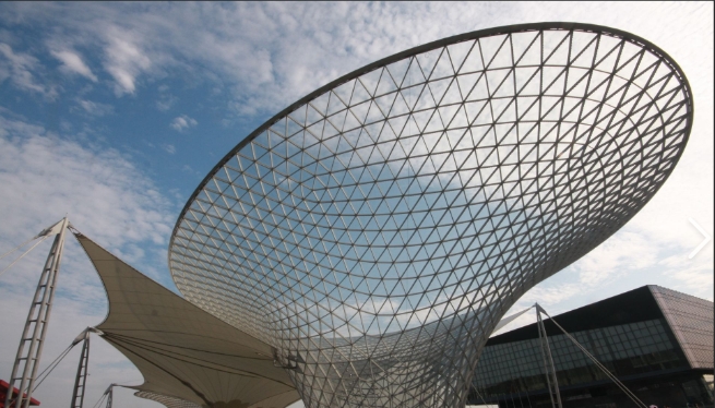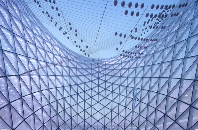 索膜結構建筑應用場景:其應用場景廣泛,可在體育場館、展覽中心、機場航站樓、景觀建筑、商業建筑等領域內使用。在體育場中,館如北京的國家體育場“鳥巢”,其設計靈感源于索膜結構思想,索膜結構可為體育場館提供大跨度無柱空間,滿足觀眾視線和賽事功能需求。在展覽中心能夠提供寬敞明亮的無柱展覽空間,便于展品布置和人流疏散,同時自然采光也能提升展覽效果。在機場航站樓可創造出開闊的候機和交通空間,使旅客能清晰地看到機場的布局和指示標志,膜材的透光性還能讓室內空間更加舒適。景觀建筑領域,可在公園、廣場等場所,可設計成各種造型的景觀小品、遮陽設施等,為城市增添特色和藝術氛圍。在商業建筑中,如商業街、購物中心的入口、屋頂或中庭等部位,可采用索膜結構來吸引顧客,營造獨特的商業氛圍。