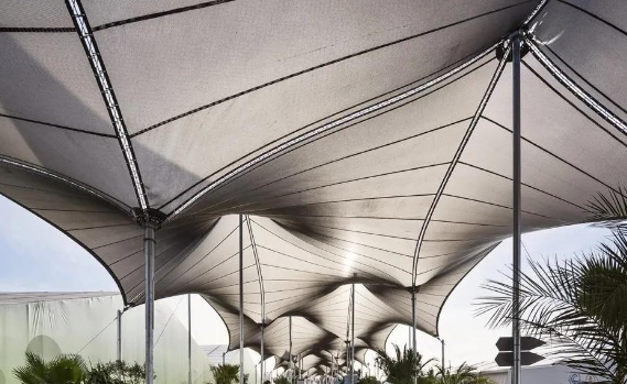 索膜結構建筑的優勢特點:其優勢特點有大跨度無柱空間、輕質節能、快速施工、藝術表現力、造型自由、節能環保、抗風抗震強、透光性好、維護成本低等。大跨度無柱空間表現在其能突破傳統結構限制,覆蓋面積可達數萬平方米(如青島頤中體育場3萬㎡屋面)。輕質節能表現在其自重僅為傳統建筑的1/30,減少基礎造價;透光膜材降低日間照明能耗。快速施工主要指工廠預制膜片與索構件,現場組裝效率高,工期可比傳統建筑縮短75%。藝術表現力是指曲面造型自由靈動,如大阪世博會盧森堡館以莫比烏斯帶為靈感的膜結構,兼具投影載體功能。造型自由,能根據設計師的靈感,實現各種曲面、弧形等獨特造型,讓建筑物更具藝術性。節能環保,使用材料較少,制造過程能耗低,膜材透光性好,可大幅減少白天人工照明需求。施工快速,材料輕便,通常通過預制組件進行安裝,施工周期短,能節省人工和時間成本。抗風抗震強,輕質和柔性特點使其在面對風力或地震時能分散外力,減少直接沖擊,提升安全性。透光性好,膜材的透光性可為建筑提供所需照度,創造出自然漫射光的室內空間視覺環境,夜晚還可成為光的雕塑。維護成本低,一些膜材如 PTFE 膜材抗老化性能好,壽命長,且膜面光滑,灰塵等不易附著,經雨水沖刷可恢復清潔。