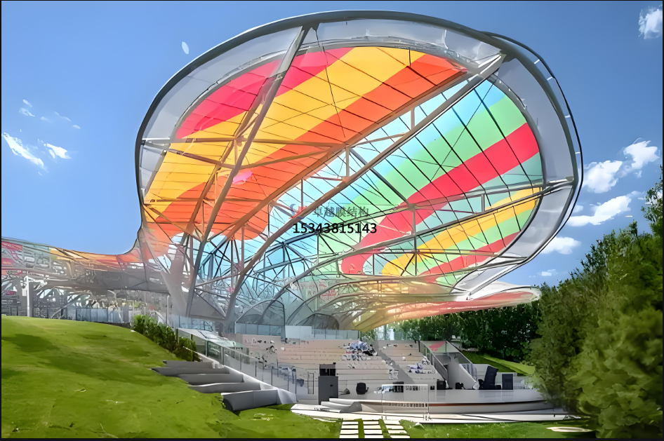 案例 :膜結(jié)構(gòu)遮陽棚采用PVC/PVDF材質(zhì),顏色豐富(如橙色、藍(lán)色),與綠植形成對比,提升公園藝術(shù)性。