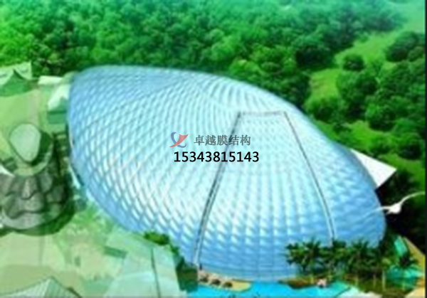 ETFE膜材:ETFE的化學(xué)名稱為乙烯-四氟乙烯共聚物,它是一種高分子材料,具有良好的耐化學(xué)性能。ETFE薄膜可通過(guò)高溫熔化ETFE顆粒后經(jīng)擠壓成型得到,用于建筑屋面或墻面材料時(shí),厚度通常為50~300um.純凈的ETFE無(wú)色,可加工到透明的ETFE薄膜,透光性高達(dá)95%.也可以在ETFE中混入添加劑進(jìn)行染色,得到各種顏色的ETFE薄膜。