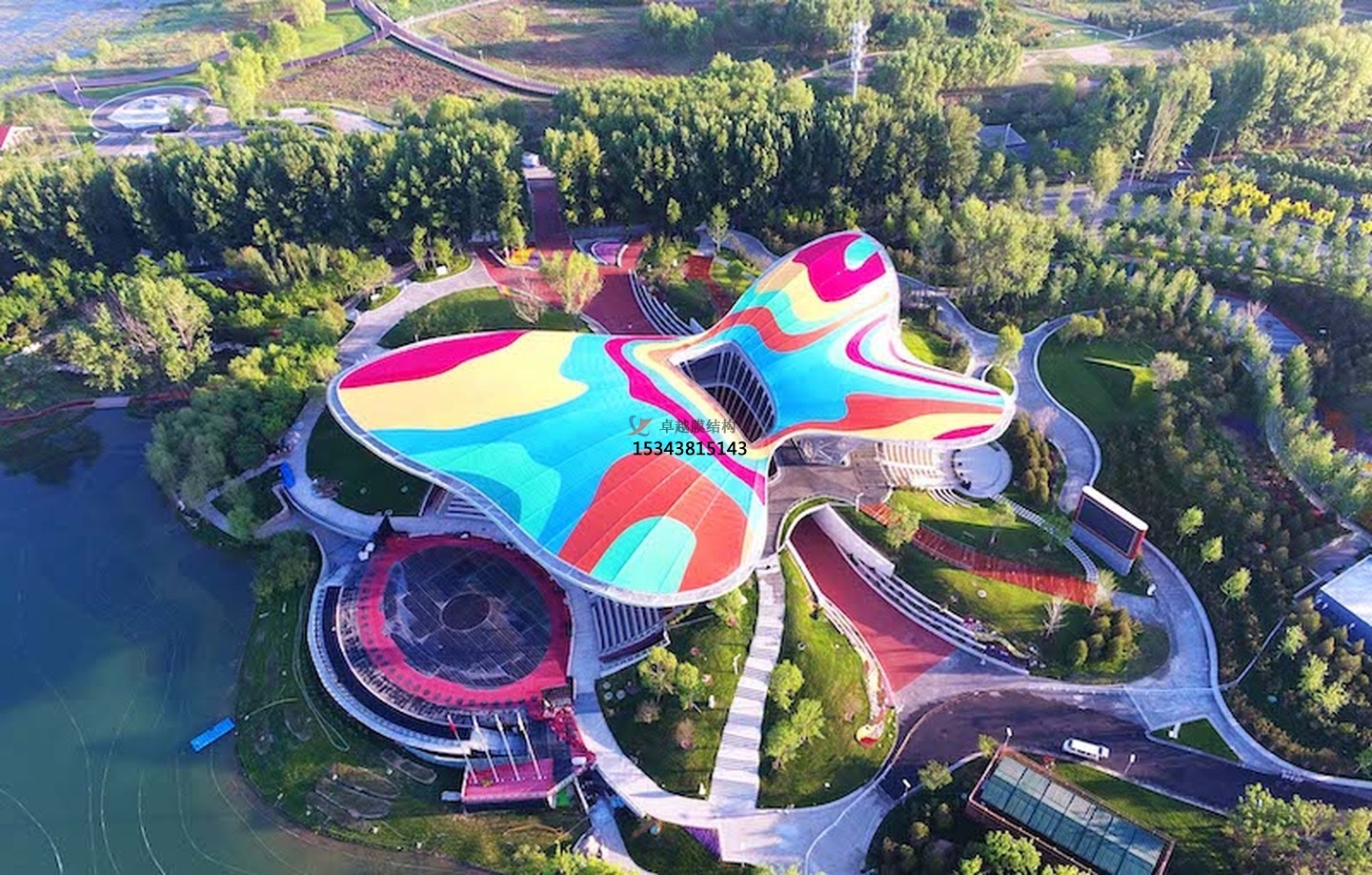 ETFE膜材除了常規的透明、藍色、白色、銀色鍍點外,其實還有五顏六色的彩色系列。今天就給大家介紹一個ETFE彩色膜應用的經典案例:2019的北京世園會的主場館——媯汭劇場,外觀為彩色蝴蝶造型。