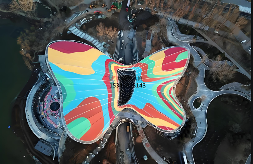 ETFE膜材除了常規的透明、藍色、白色、銀色鍍點外,其實還有五顏六色的彩色系列。今天就給大家介紹一個ETFE彩色膜應用的經典案例2019年北京世園會的主場館——媯汭劇場,外觀為彩色蝴蝶造型。