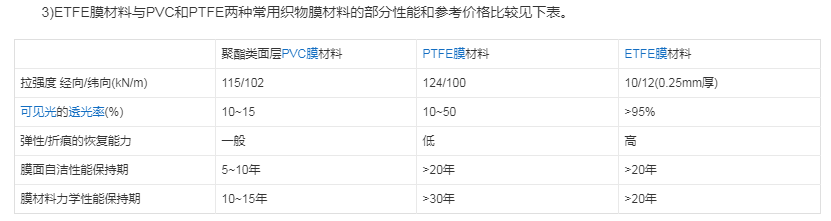 ETFE、PVC和PTEF織物膜材料的部分性能比較