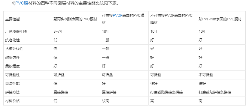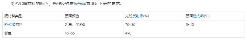 1)PVC膜材料的面層,在保質期內應具有穩定的抗腐蝕、抗紫外線侵蝕的能力,表面具有自結性能。
