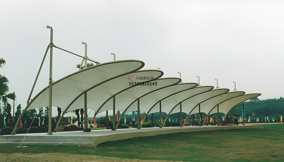1、高強度與輕重量:膜結構所采用的材料是高強度織物材料,經緯交織,雙面PVDF涂層,耐久性長達10年以上。同時,其重量輕,相當于普通鋼結構屋面的1/10,能滿足大跨度的要求,非常適合高爾夫球場發球臺等大面積區域的建設。