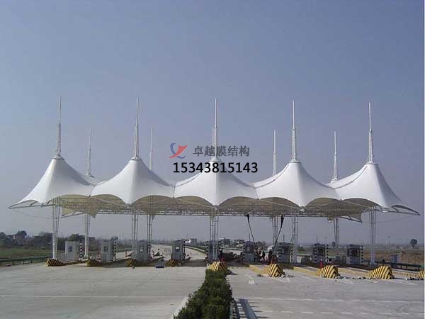收費站頂棚運用膜結構來設計建造十分可取,收費站廣場空間跨度大,屬于開放空間,通過膜材料結合鋼柱支撐的膜結構能使用收費站整體環境起到美化作用。同時膜結構具備功能上的諸多優點,相信不久的將來,收費站膜結構頂棚會越來越常見。