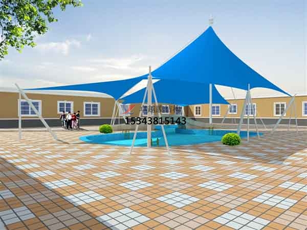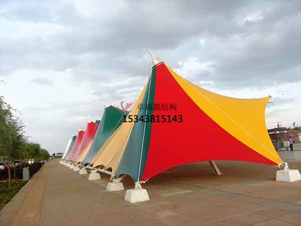 索膜結(jié)構(gòu)景觀棚的特點:索膜結(jié)構(gòu)景觀棚具有造型美觀獨特、輕質(zhì)高強、環(huán)保節(jié)能和自潔性強等特點。索膜結(jié)構(gòu)可以通過調(diào)整張拉力和支撐點的位置,創(chuàng)造出各種獨特的形態(tài),如波浪形、穹頂形、風帆形等,甚至可以設計成抽象的藝術圖案,具有強烈的雕塑感和現(xiàn)代藝術氣息,能夠為環(huán)境增添獨特的景觀效果。膜材一般采用高強度的纖維織物,如玻璃纖維、聚酯纖維等,重量輕但強度高,其自重比傳統(tǒng)建筑結(jié)構(gòu)小得多,同時卻能承受較大的荷載,在大跨度空間的應用上具有優(yōu)勢,可有效降低基礎和支撐結(jié)構(gòu)的荷載。膜材具備良好的耐候性和抗老化性能,使用壽命較長,一般可達十年以上,減少了頻繁更換帶來的資源浪費和環(huán)境污染。而且部分膜材可回收再利用,符合當今社會提倡的綠色發(fā)展理念。一些高品質(zhì)的膜材表面具有防護涂層,能夠使膜面具有自潔功能,雨水沖刷即可帶走表面的灰塵和污垢,保持膜面的清潔,降低了維護成本。