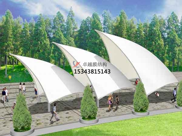 6、這是膜結構景觀工程的案例,膜結構所用的膜材本身具有良好的透光率,建筑空間白天可得到自然的漫射光,能節約大量照明能源;相對于傳統涂理PVC的聚醋纖維膜材,涂覆PTFE的玻瑞纖維膜材的透射光譜更加均勻具有外觀新穎,經濟適用,適用壽命長,結構更安全,質量更可靠。