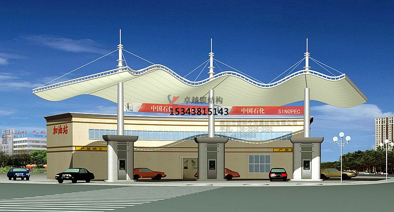 加油站罩棚是加油站的重要組成部分,設計加油站罩棚不僅僅要具有牢固、省電、防水等功能,還要美觀大方呢。膜結構輕巧、別致的造型在停車場及候車廳的建設中擔當了重要角色,除了滿足防風雨、防日曬等基本功能外,并有較好的標識招攬效果,展現了人們個性化的一面。