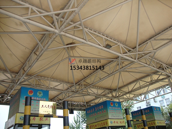 2、 混凝土結構主體加鋼拱:以上兩種更簡單的膜結構,依平面的形狀,如方形、菱形等,可有許多變化,拱的間距依使用的膜材強度、設計荷載、風力等確定。