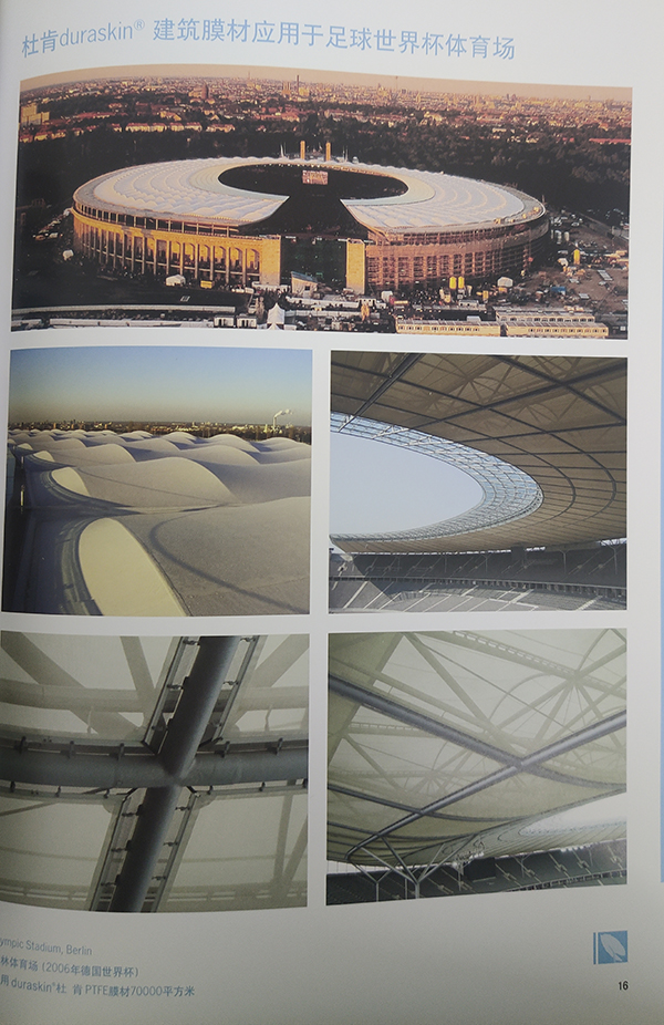 3、有眾多的成功案例:在歐洲的大型PVC項目幾乎都采用杜肯膜材:1993年斯圖加特體育場34000平方米;1994年德國Halle網球中心10000平方米;1995年奧地利機場停車場16000平方米;1996年土耳其安卡拉體育場16000平方米;德國科隆音樂中心25000平方米;1997年德國漢堡網球中心10000平方米;1998年法國圖盧茲體育場15000平方米;999年德國漢堡體育場50000平方米;2000年CARGOLIFTER車間110000平方米;2001年美國奧蘭多Dolphin賓館15000平方米等等。