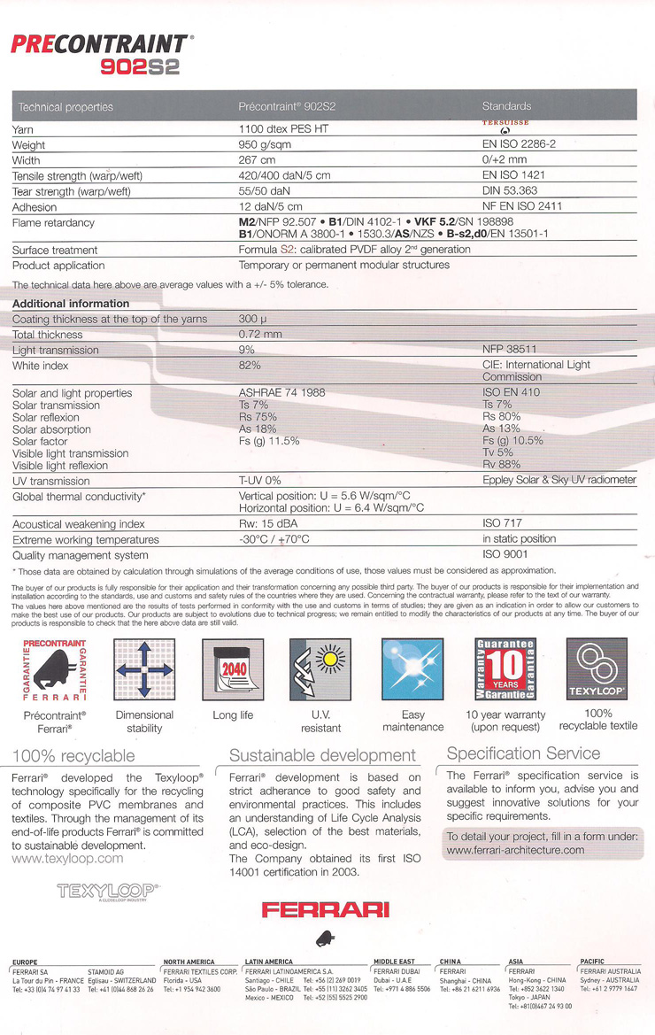 法拉利膜材十多年來,法拉利(PVDF)表面處理的復(fù)合膜材被應(yīng)用在全世界重要的織物建筑工程中。現(xiàn)在,第代膜材再次確認(rèn)了這一出眾材料性能的更新發(fā)展。法拉利研發(fā)了第代材料正是為了滿足建筑師和業(yè)主在新世紀(jì)之初對于織物建筑提出的要求。這一 全新的膜材得益于更新的科研技術(shù),即將PVDF和硬化介體完美地結(jié)合。這種特殊的結(jié)合明顯地提高了材料的機(jī)械強(qiáng)度、使用壽命,并能長期保持織物建筑的原始 美觀。第代膜材在積累了10多年的經(jīng)驗的基礎(chǔ)上,可以提供專業(yè)保證。法拉利現(xiàn)在能夠根據(jù)要求和每個項目的具體情況,提供12年質(zhì)量保證 (PRECONTRAINT702除外)。