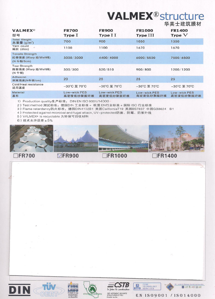 德國MEHLERHAKU米樂公司擁有165年(1837年—2003年)的制造業(yè)經(jīng)驗(yàn)。 通過ISO9001質(zhì)量體系認(rèn)證。所有產(chǎn)品均經(jīng)過嚴(yán)格的DIN德 國工業(yè)標(biāo)準(zhǔn),以及各個(gè)更好的的膜材工業(yè)標(biāo)準(zhǔn)。2002年,德國米樂公司獲聘為中華人民共和國建設(shè)部《索膜建筑結(jié)構(gòu)制品》行業(yè)標(biāo)準(zhǔn)編制委員成員。 德國米樂的產(chǎn)品系列涵蓋環(huán)保等各種PVC膜材領(lǐng)域,包括:建筑工程、輕型結(jié)構(gòu)、廣告、遮陽、汽艇、軍用、裝飾、水利環(huán)保,等等。