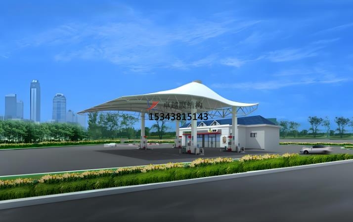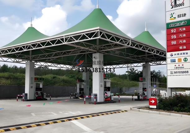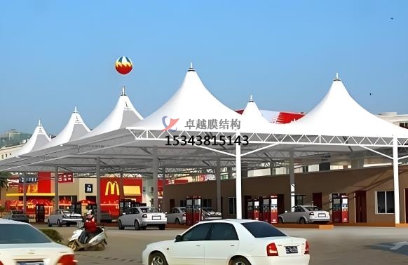 加油站張拉膜特點:造型美觀,透光性好,節能環保,抗震性強,施工便捷,經濟性好。張拉膜結構可通過獨特的曲面造型和豐富色彩,為加油站營造出現代、時尚的外觀,與周邊環境相融合,成為城市景觀的一部分。膜材具有較高的透光率,一般在 10%-20% 左右,部分可達 30% 以上,可提供自然采光,減少白天人工照明需求,節約能源。透光膜材可引入自然光減少照明能耗,結合自然通風設計降低空調使用率,材料可回收性符合綠色建筑標準,張拉膜具有良好的保溫隔熱性能,能有效降低加油站內部能耗,配合節能照明設備,可實現綠色環保目標。自重輕、柔性大,在風荷載、雪荷載等外部荷載作用下,能通過變形分散荷載,具有良好的抗震性能,可抵抗 8 級地震。加油站膜結構大部分構件在工廠預制完成,現場組裝和安裝速度快,施工周期可比傳統建筑方式縮短一半以上,且對環境影響小,膜材料重量輕但強度高,降低支撐結構負荷,安裝周期短,減少對加油站運營的影響。張拉膜結構廣泛應用于加油站頂棚設計,覆蓋加油區和洗車區域,為車輛及人員提供遮陽、防雨、防雪的全天候保護。在高速公路服務區、城市主干道等車流量密集區域,部分加油站結合張拉膜結構擴展服務功能,例如設置司機休息區、戶外餐飲區或小型便利店,通過靈活的空間布局提升用戶體驗,其高效覆蓋能力尤為突出。雖然膜材和鋼結構等材料成本相對較高,但由于施工周期短、維護成本低,長期來看綜合成本具有優勢,且使用壽命可達 15-30 年甚至更長。