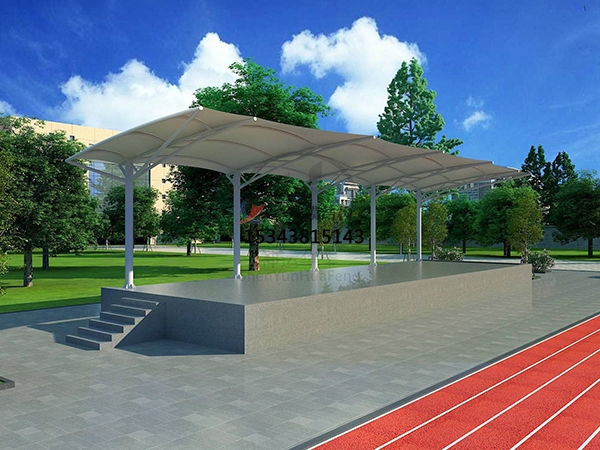 足球場看臺遮陽棚常見結構形式:足球場看臺遮陽棚的形式也有很多,其中常見的有張拉膜結構、骨架式膜結構和充氣膜結構。張拉膜結構的原理是通過拉索或支撐結構將膜材張拉成一定的形狀,利用膜材的張力來抵抗外荷載。這種結構形式造型輕盈、美觀,具有良好的空間表現力,能夠為足球場增添獨特的景觀效果。同時,張拉膜結構的施工速度快,可在較短的時間內完成安裝。骨架式膜結構的原理是以鋼骨架或鋁合金骨架為支撐,將膜材固定在骨架上形成遮陽棚。骨架式膜結構的穩定性好,能夠承受較大的荷載,適用于各種規模的足球場看臺。其骨架可以根據設計要求進行多樣化的造型,與膜材相結合,營造出豐富的建筑外觀。充氣膜結構的原理是利用空氣壓力使膜材膨脹形成一定的形狀,通過維持膜內的氣壓來抵抗外荷載。充氣膜結構的優點是重量輕、施工速度快、成本較低,但其對氣密性要求較高,需要配備專門的充氣設備和控制系統,以保證遮陽棚的正常使用。