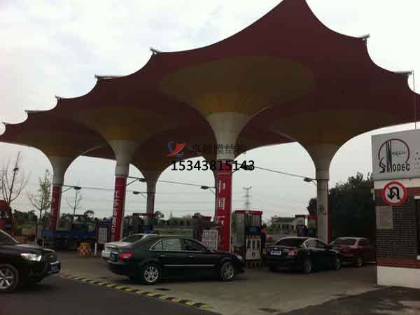 6、展開加油站罩棚設計安裝的膜體前,在平臺上鋪設臨時布料,以保護膜材不被損傷及膜材清潔,嚴格按確定的順序展開膜體。打開包裝前應校對包裝上的標記,確認安裝部位,并按標記方向展開,盡量避免展開后的膜體在場內移動。
