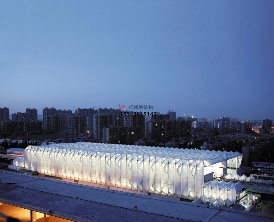 在PTEE膜片熱合過程中,則需要記錄的數據有其熱合設備的工作溫度,壓力與加熱時間,依據不同的數據組合冷卻時間參數,對其采用密封條拉伸試驗來進行數據確定,并記錄相關數據。在其熱合過程中,其熱量應當是依據其兩個膜片的拉伸力來作用的,其折痕不是平面振膜,其可有效控制熱收縮率,確保其密封區干凈無灰塵,同時也不含一些可以靜電吸附的雜物。PTFE膜材停車棚其兩個密封材料之間也必須有熱熔焊接,不允許有焊縫存在,以確保其強度足夠大,水密封性能良好。對于膜片與成品膜進行處理的時候也不得對其直接進行折疊,此時應當使用一些卷曲或是折疊的軟材料來進行襯墊,包裝材料選取的時候也要注意不要有脫色現象出現。