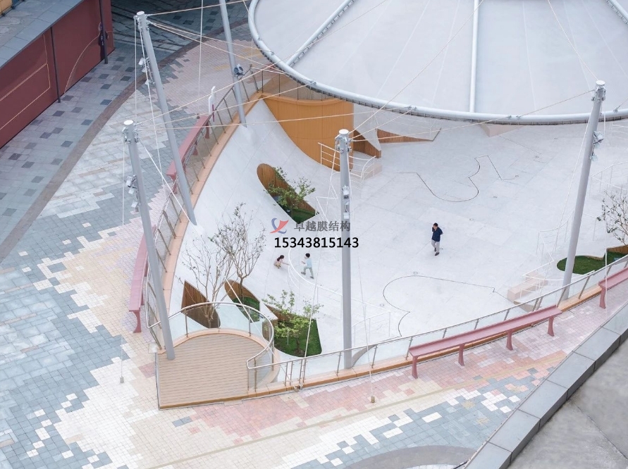 “浮庭”由上方如同水母般漂浮的半透明織物膜結構與下方懸浮感的地景花園共同組成。膜結構既成為了廣場的頂蓋,形成包覆與洞天的感受,也作為織連體引導主要流線銜接了室外幾個重要節點。結合原混凝土柱的加寬基礎上支起鋼柱,以懸吊與支承合作的形式將膜結構撐起,減少了廣場中結構的出現。