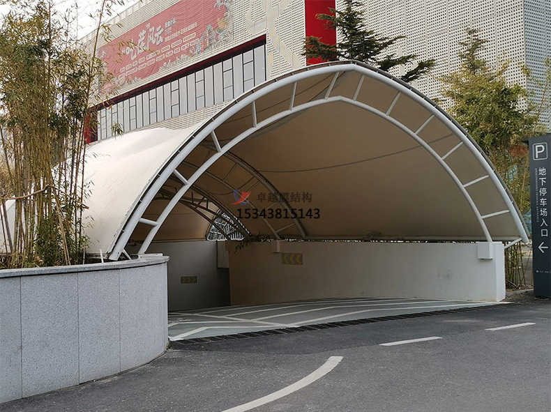 該小區的入口通道采用了雙層膜結構的設計,外層膜采用高強度聚酯纖維材料,內層膜采用聚乙烯材料,兩層膜之間填充了聚氨酯泡沫材料,具有優秀的實用性和功能性,為居民的停車提供了便利。在膜材的選擇上,采用了環保材料,符合現代環保理念。此外,自動化控制系統的使用,也使得遮陽雨棚更好的利用。以保證入口通道的舒適度和安全性。整個膜結構造型簡潔、大方,線條流暢,呈現出現代科技感。膜結構的使用不僅提高了小區的安全性能,還增加了小區的景觀價值,成為小區的一大特色。