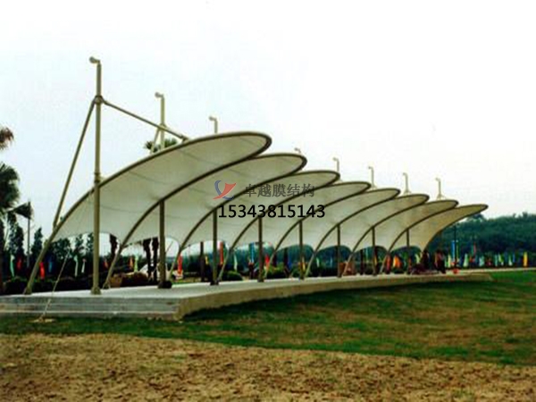 膜結構停車棚具有藝術性,充分發揮建筑師的想象力,又體現結構構件清晰受力之美。由于膜材具有一定的透光率,白天可減少照明強度和時間,能很好地節約能源。同時夜間彩燈投射形成的絢爛景觀也能達到很好的廣告宣傳效益。