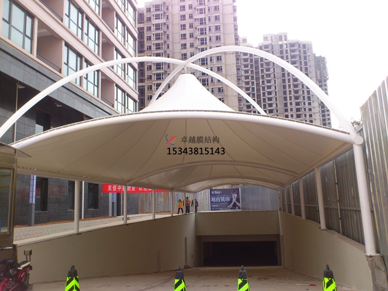 膜結構雨棚屬于軟性材料,本身自動輕,耐高溫、抗紫外線,使用壽命長達15至20年。