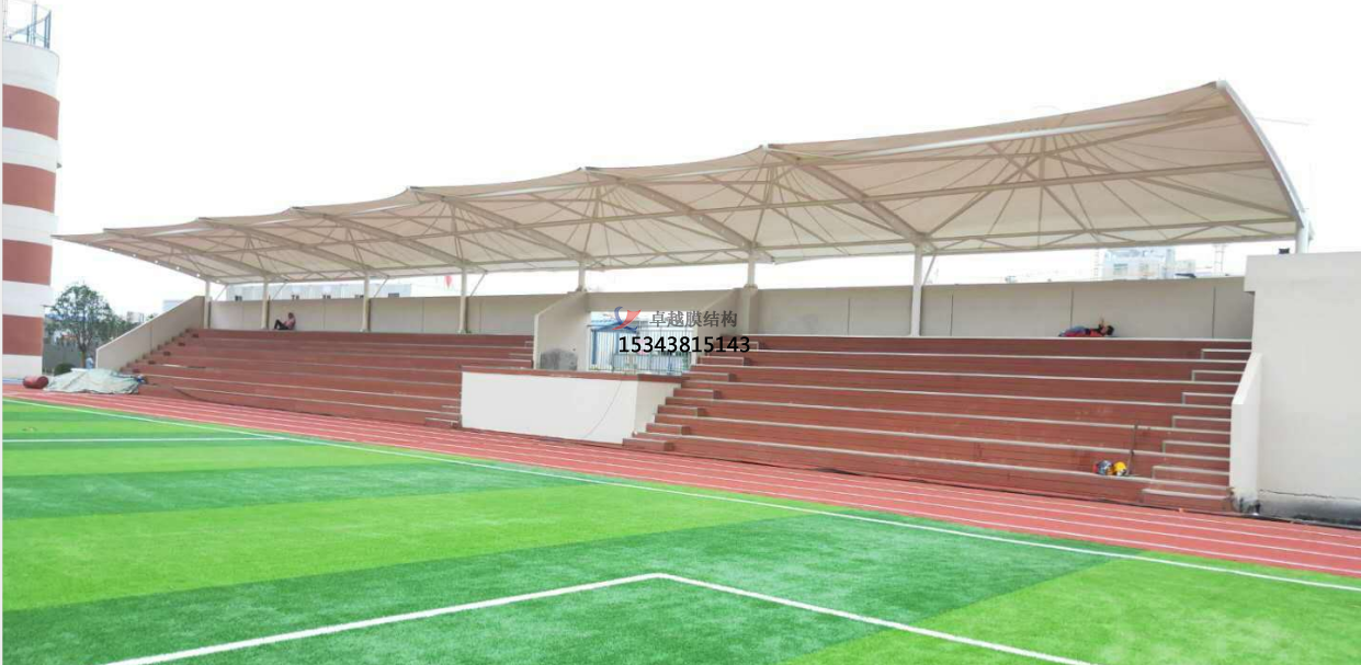 膜結構看臺在體育設施上主要應用在學校操場運動看臺或主席臺屋頂,另外大型體育場館看臺膜結構屋頂也屢見不鮮。看臺造型般由貝殼形峰膜及部張拉膜組成,形式新穎活潑。膜結構看臺將鋼架、索、膜巧妙結合,通過薄膜、膜邊索、脊索、谷索、拉索、拉桿及定的格構梁來穩定。膜頂平滑過渡,結構美觀、輕巧、整體造型相互輝映,別具格。