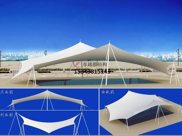 膜結(jié)構(gòu)的結(jié)構(gòu)形式:是由多種高強(qiáng)薄膜材料(PVC或Teflon)及加強(qiáng)構(gòu)件(鋼架、鋼柱或鋼索)通過一定方式使其內(nèi)部產(chǎn)生一定的預(yù)張應(yīng)力以形成某種空間形狀,作為覆蓋結(jié)構(gòu),并能承受一定的外荷載作用的一種空間結(jié)構(gòu)形式。