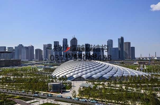 膜結構是一種建筑與結構完美結合的結構體系。它是用高強度柔性薄膜材料與支撐體系相結合形成具有一定剛度的穩定曲面,能承受一定外荷載的空間結構形式。其造型自由輕巧、阻燃、制作簡易、安裝快捷、節能、安全等優點,因而使它在世界各地受到廣泛應用。這種結構形式特別適用于大型體育場館、入口廊道、小品、公眾休閑娛樂廣場、展覽會場、購物中心等領域。