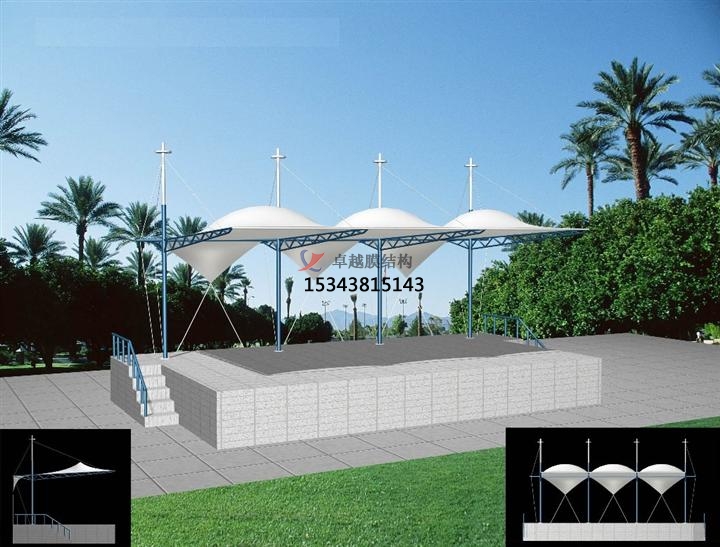 膜結構看臺的防曬效果是非常好的,這主要它所使用的膜材有關。膜結構的膜材主要有四種:PVC、PVF、PVDF和PTFE,這四種材料在具有一定的色彩效果的同時,還擁有很好的透光性與防曬性,可以濾除大部分紫外線,同時對自然光的透射率還可達百分之二十五,在經過設計后,透射光在結構內部可產生均勻的漫射光,無陰影、無眩光,具有良好的顯色性,能夠在夜晚配合環境光和照明系統的作用下發出自然柔和的色彩,可以說既能起到防曬效果,又能成為很好的景觀性建筑。