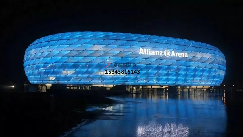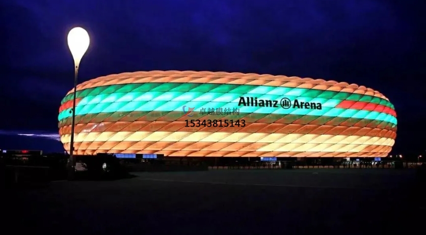 安聯(lián)球場(chǎng)的外墻由許多個(gè)ETFE氣枕構(gòu)成,內(nèi)嵌發(fā)光系統(tǒng),超過(guò)三十萬(wàn)個(gè)LED燈可在夜晚組成1600 萬(wàn)種顏色圖形。它是世界上最早能實(shí)現(xiàn)變色的球場(chǎng)。由于每個(gè)表皮構(gòu)建有34度的斜角,即使身處最高層看臺(tái)也能提供同樣棒的視覺(jué)效果。