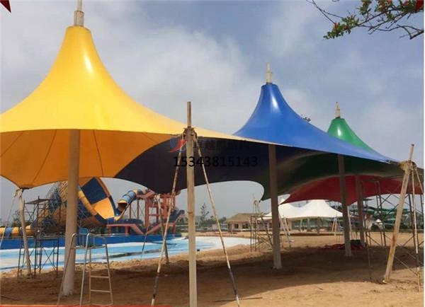 (2)藝術(shù)性。張拉膜景觀突破了傳統(tǒng)的建筑結(jié)構(gòu)類型,以造型學、色彩學為依托,可結(jié)合自然條件,充分發(fā)揮建筑師的想象力,根據(jù)創(chuàng)意建造出傳統(tǒng)建筑難以實現(xiàn)的曲線及各種造型,且色彩豐富,富有時代氣息,體現(xiàn)結(jié)構(gòu)構(gòu)件受力之美。配合燈光易形成夜景,給人以現(xiàn)代美的享受。