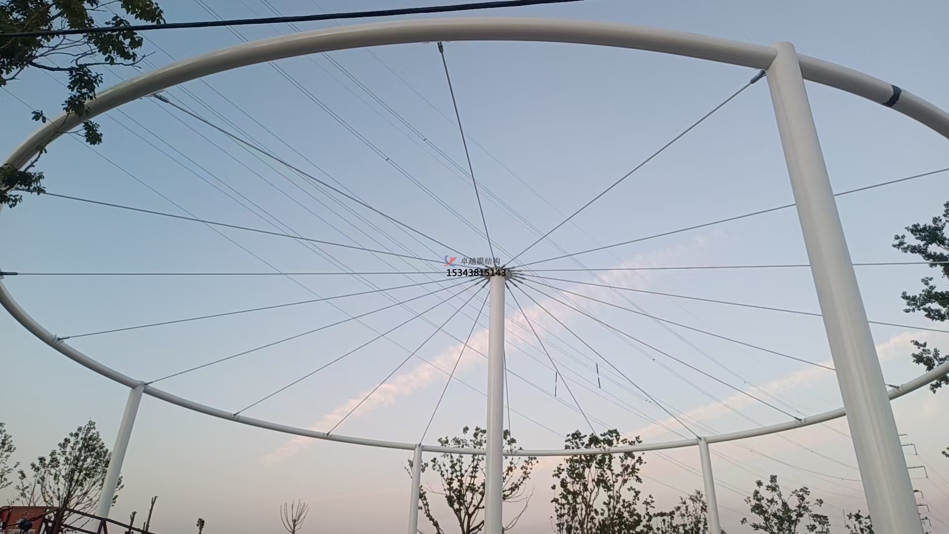 在支架上安裝鋼絲繩,用于固定膜材料。首先,要在膜材料上測量出鋼絲繩的長度和位置,并將鋼絲繩固定在支架上。然后,將鋼絲繩拉緊,并用電鉆將鋼絲繩固定在膜材料上。需要注意的是,鋼絲繩的拉力和固定方式要合適,不能太松或太緊,同時要確保鋼絲繩的安全性和穩定性。