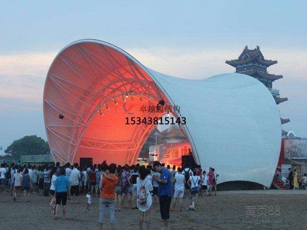 1、混凝土結(jié)構(gòu)主體加鋼拱以上兩種更簡單的膜結(jié)構(gòu),依平面的形狀,如方形、菱形等,可有許多變化,拱的間距依使用的膜材強度、設(shè)計荷載、風(fēng)力等確定。