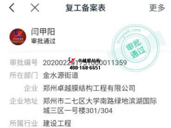 今天你復工了嗎?我們卓越膜結構工程有限公司經過層層審批,更終批準于2020年3月2號正式復工。