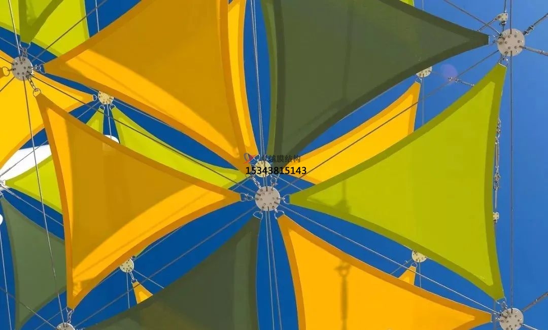 381網孔膜開孔度為4%,具有很好的遮陽透氣功效。Soltis92織物織就的明黃,明綠及暗綠的三角遮陽帆層層疊疊,在自然光及夜景燈光下非常好看。