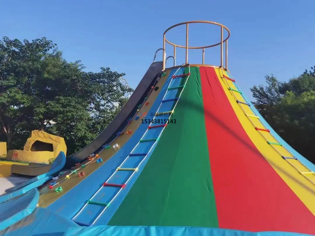 小朋友們可以從底部貼緊“火山”,雙手抓住巖石向上攀登,當成功攀巖到山頂時,可以從“火山”頂部通過滑梯或者“火山”表面滑下來。