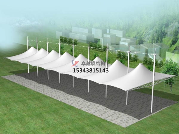 第點,膜結構停車棚整體框架采用方鋼焊接成型龍骨架,框架整體做防銹處理,刷防銹底漆三遍,表面噴涂白色高級汽車漆,停車棚主立柱一般采用220mm鋼管或工字鋼作停車棚的支撐柱,車棚身整體結構牢固抗震防風系數高,耐腐蝕;
