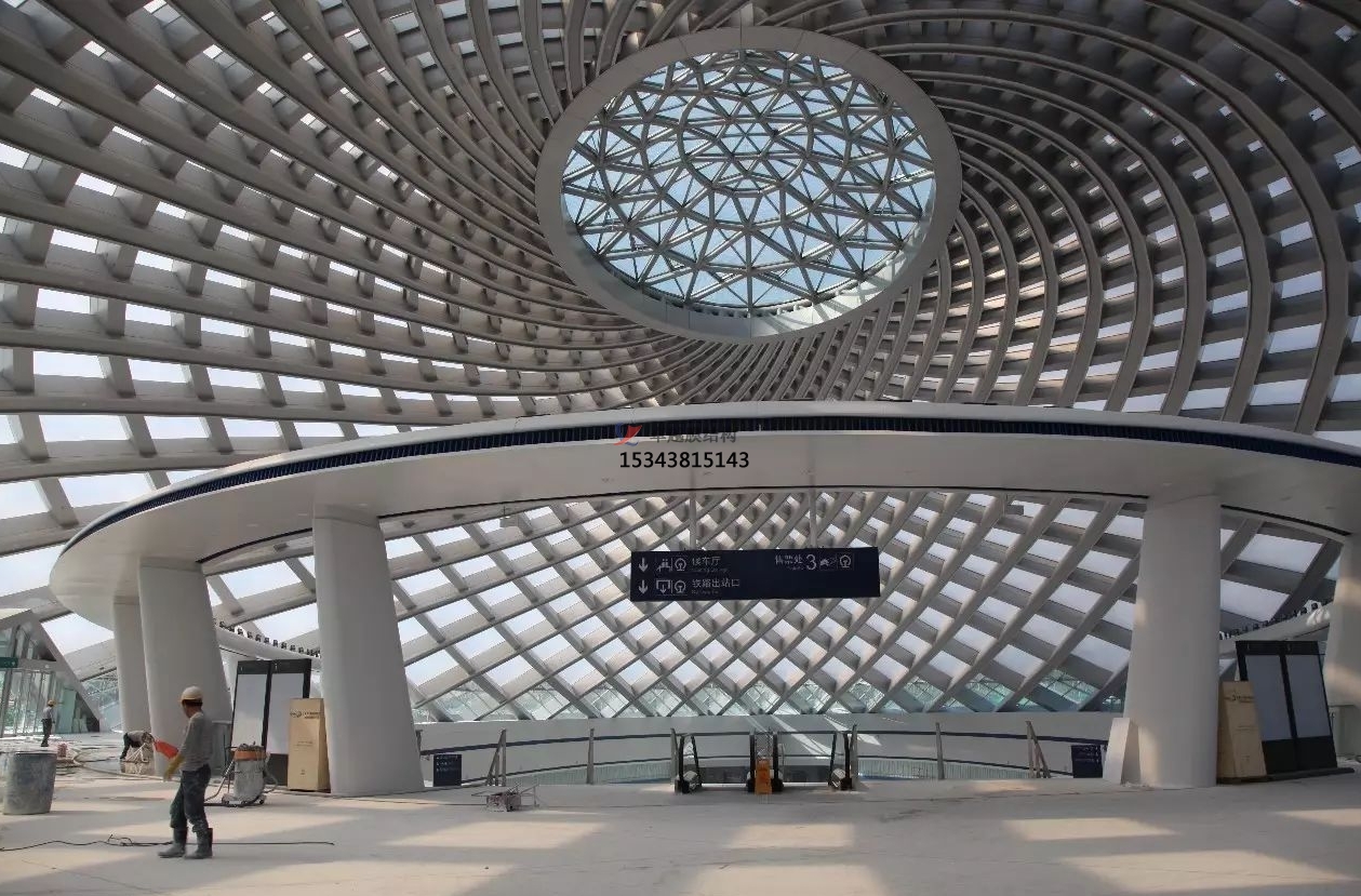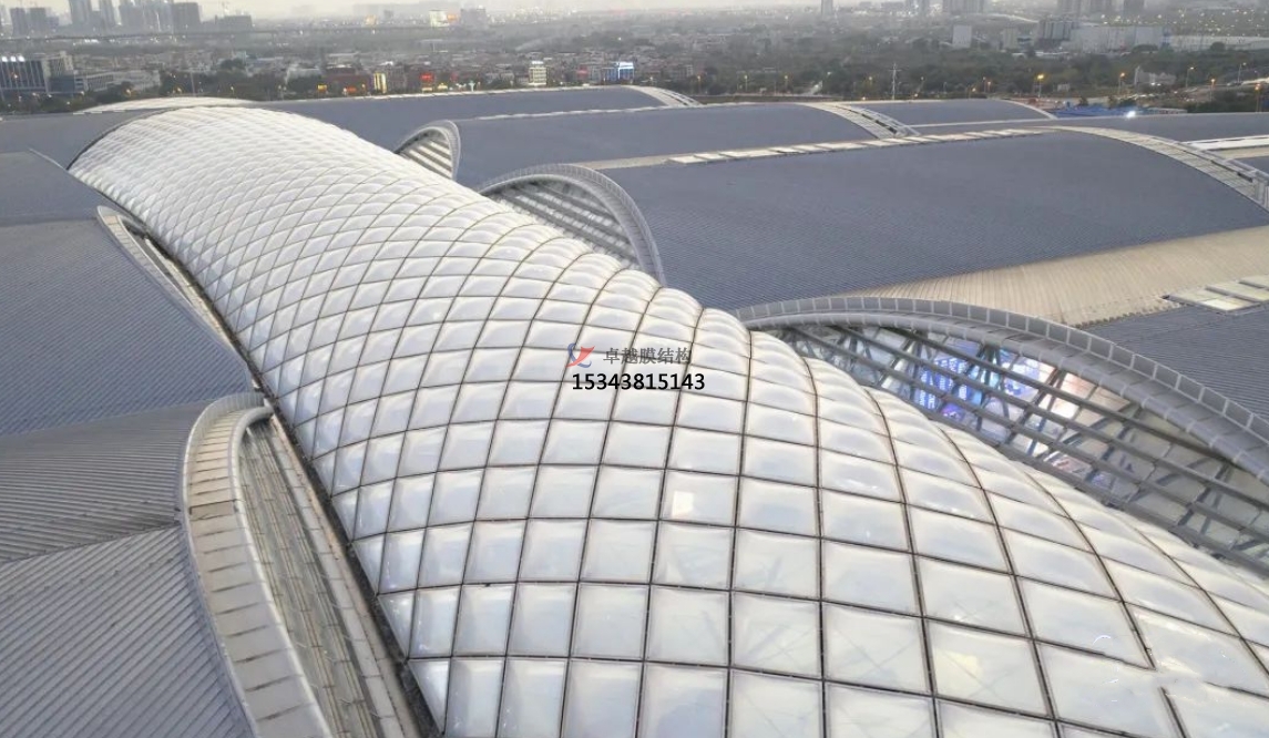 高鐵站膜結構是一種新型的建筑結構形式,它采用高強度柔性薄膜材料與支撐體系相結合,通過一定的技術手段,使其內部產生一定的預張力,從而形成具有一定剛度和穩定性的空間結構體系。這種結構形式具有重量輕、跨度大、造型美觀、施工速度快等優點,能夠滿足高鐵站大空間、大跨度的建筑需求。