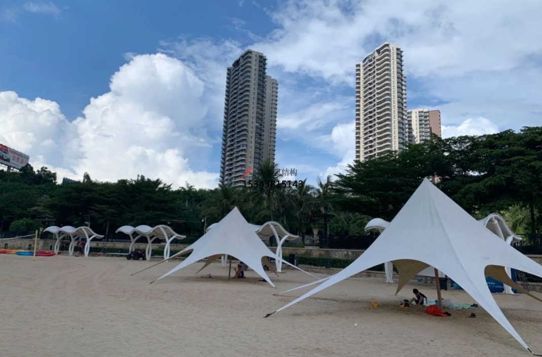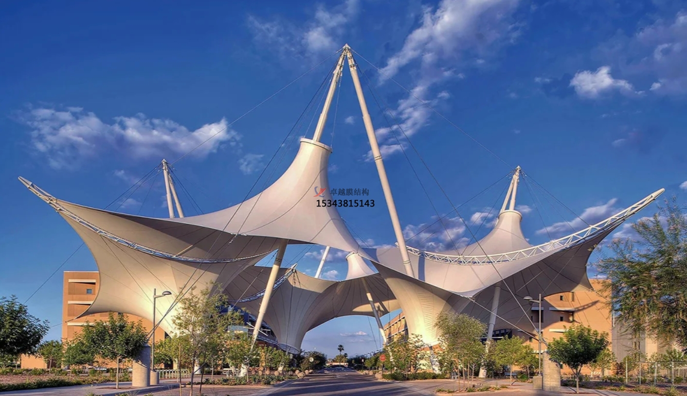 景觀棚膜結構最大的特點之一就是其幾乎不受限制的造型能力。設計師可以根據不同的場地需求、文化背景以及功能要求,創造出如貝殼般優雅的曲線、如帆船般靈動的輪廓、如花朵般綻放的形態等等。這種獨特的造型不僅能夠成為視覺上的焦點,提升整個區域的景觀品質,還能很好地與周圍的自然環境或建筑風格相融合,形成和諧統一的整體畫面。