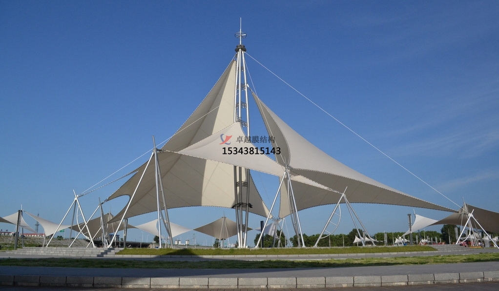 2.景觀膜結構能提供豐富多彩的用途,與周圍環境溶為一體并創造出讓人們盡情享受的快樂空間.它充分展示了結構構件清晰受力的藝術之美并巧妙的整合周圍的環境展示給人們一種高貴典雅/浪漫溫馨之感!