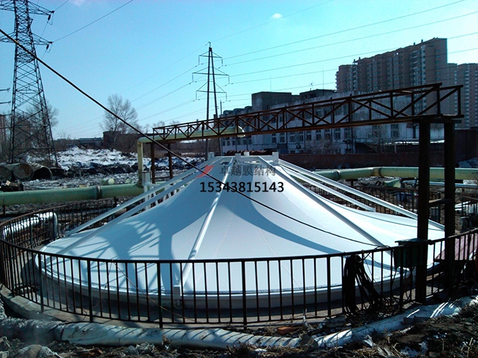 2.確認(rèn)膜材的品種:污水池加蓋除臭選用的膜材有許多中,應(yīng)根據(jù)池體的跨度挑選適宜的膜材才干達(dá)到預(yù)期的作用.一般,關(guān)于大跨度而言,選用污水池專用膜材氟碳纖維膜比較適宜,因?yàn)檫@種膜材具有很強(qiáng)的抗腐蝕能力,能對(duì)池內(nèi)廢氣起到抗腐蝕的作用,無形中保證了膜材的使用壽命;