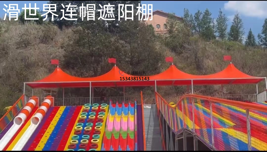 樂園內的遮陽棚設計獨特,既可遮陽又可擋雨,為游客提供了一個舒適的游玩環境。遮陽棚采用輕質、高強度的材料制成,具有良好的抗風抗壓性能,即使在惡劣的天氣條件下也能為游客提供保護。此外,遮陽棚的設計還充分考慮到了安全性,采用了防滑、防撞等措施,確保游客在游玩過程中的人身安全。