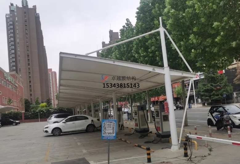 膜結構小轎車充電樁停車棚雨棚是最近幾年才流行起來的,因為電動小轎車有大型的充電樁,為了充電的安全,就有了膜結構小轎車充電樁停車棚雨棚。