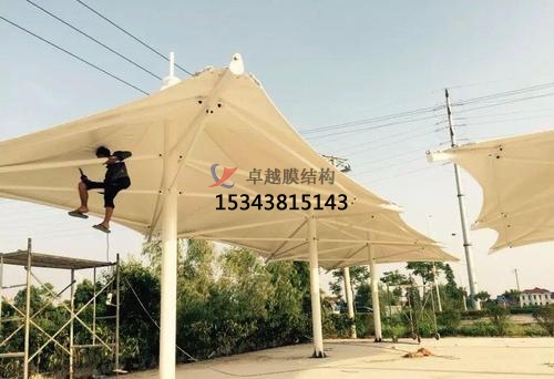 第三步:景觀膜結構遮陽棚懸掛臂時的安裝焊接工作,在做懸掛臂安裝采用焊接,檢查焊接節點檢查確認懸掛臂設計坡度,檢查準確無誤后開始焊接。