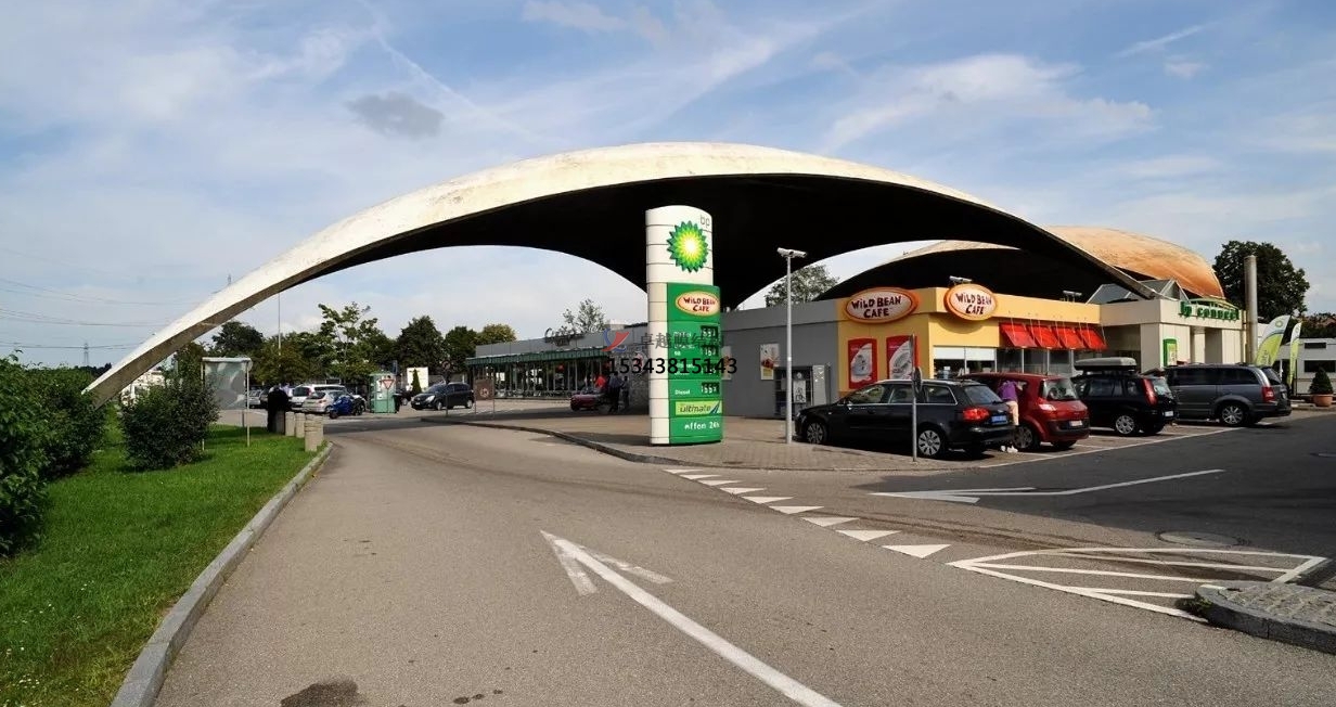 膜結構頂棚打破傳統加油站的方正造型,可定制波浪形、貝殼狀等藝術形態。例如新疆某加油站以維吾爾族紋樣裝飾膜面,融合地域文化與現代技術,成為絲路沿線的地標性建筑。其半透明材質在日光下呈現柔和光影,夜間則通過燈光營造科技感,提升品牌辨識度。