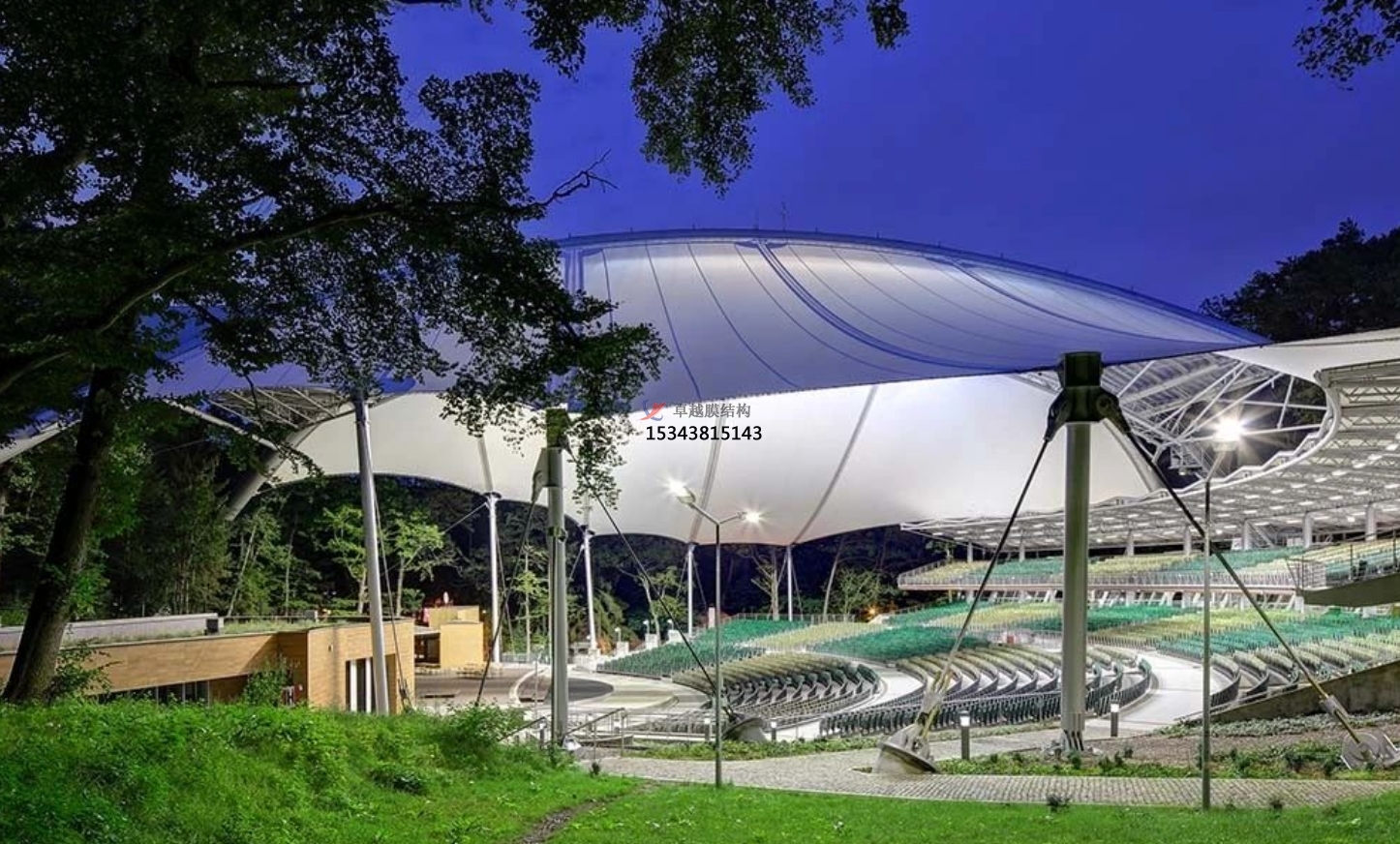 舞臺膜結構遮陽棚的膜材料具有一定的透光性,可以根據演出需要調節光線的明暗和色彩。在白天,自然光透過膜材料灑落在舞臺上,為演出增添了一份自然和溫馨;在夜晚,舞臺燈光與膜材料的透光性相結合,可以營造出夢幻般的舞臺效果。