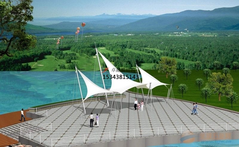 用于張拉膜景觀中的膜材是一種具有高強度、柔韌性好的薄膜材料;中心的織物基材分為聚酯纖維及玻璃纖維,而作為涂層材使用的樹脂有聚氯乙烯樹脂(PVC),硅酮及聚四氟乙烯樹脂(PTFE),它具有輕質、柔韌、厚度小、重量輕、透光性好;對自然光有反射、吸收和透射能力;它不燃、難燃或阻燃;具有耐久、防火、氣密良好等特性;表面經氟素處理(涂覆PVF或PVDF)的膜材、自身不發粘、有很好的自潔性能。