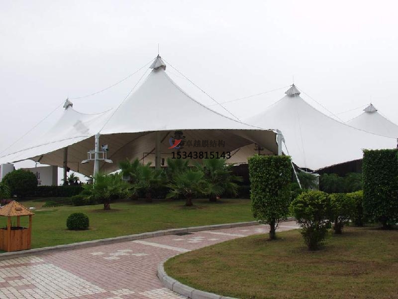 1.骨架式張拉膜景觀:以鋼構或是集成材構成的屋頂骨架。下部支撐結構安寧性高,因屋頂造型比擬單純,開口部不易受限制,且經濟效益高等特點,廣泛適用于任何大,小規模的空間。利用鋼索與支柱在膜材中導入張力以達安定的形式。除了可實踐具創意,創新且美觀的造型。